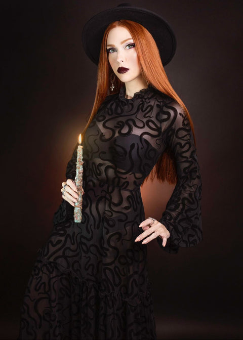 Sloane – Velvet Flocked Snake Maxi Dress with Bell Sleeves