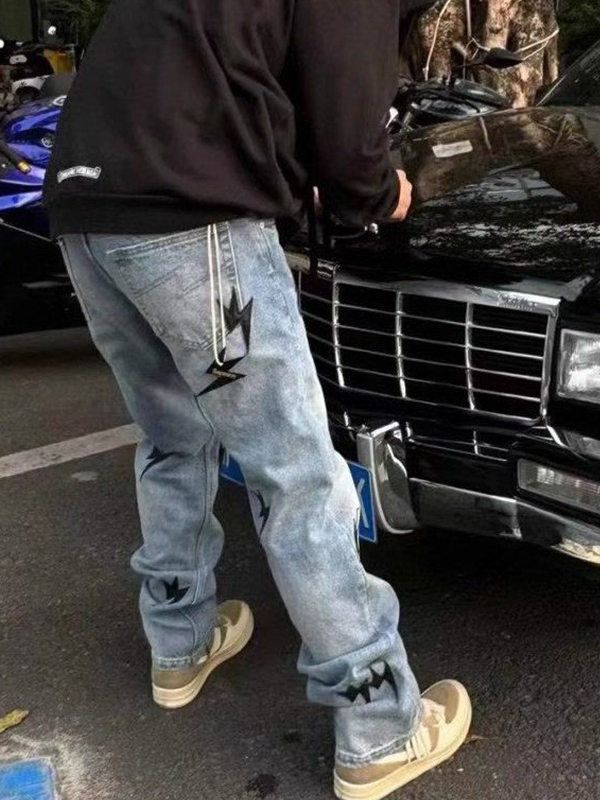 Men’s Patch Leather Lightning Loose Jeans