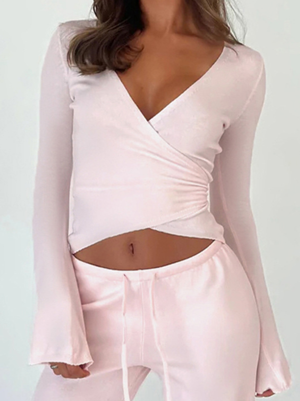 Solid Color V Neck Long Sleeves Tee
