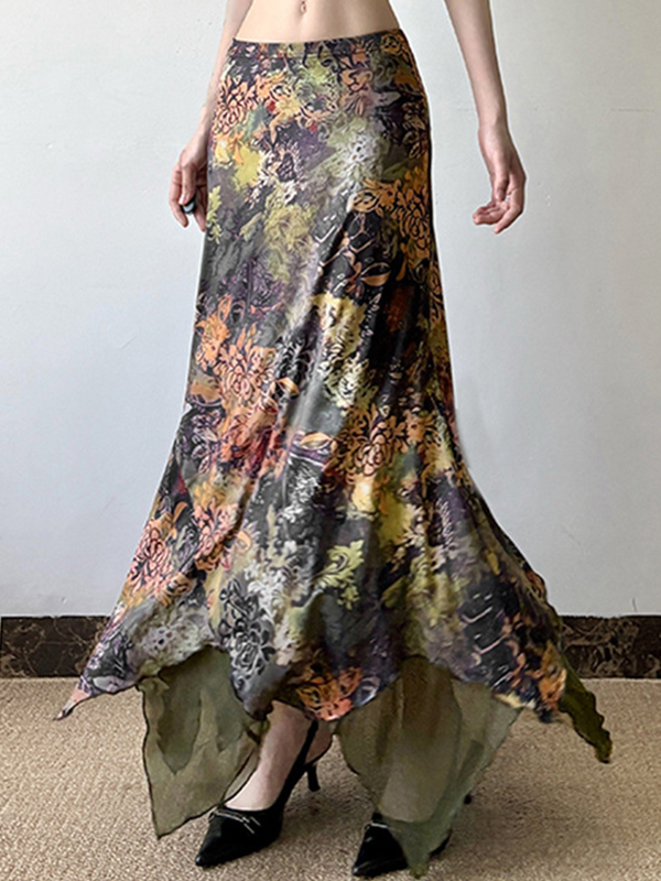 Floral Print Open Mesh Maxi Skirt
