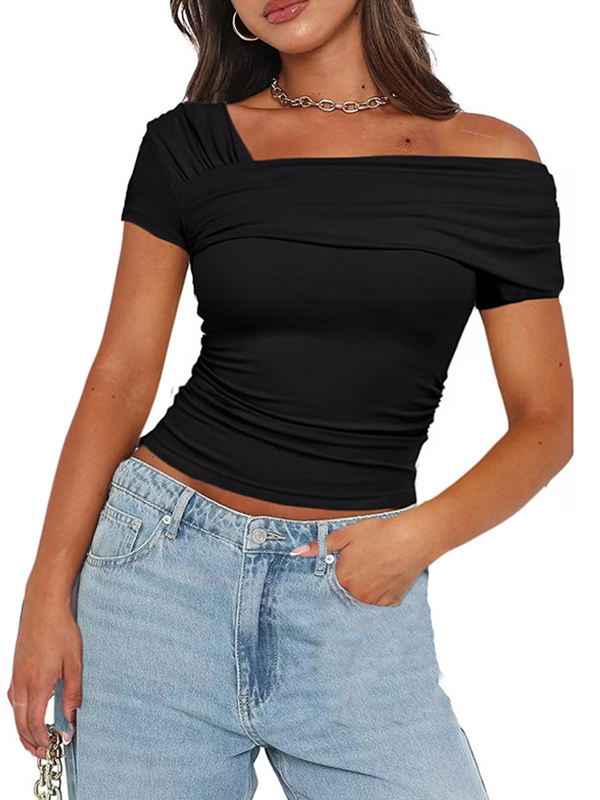 Solid One Shoulder Backless Ruched Short Sleeve Tee
