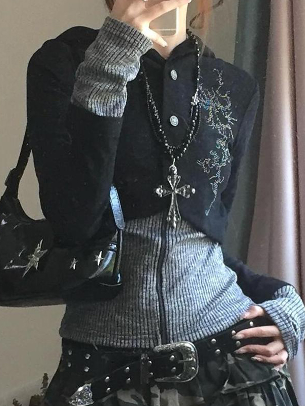 Vintage Print Lapel Neck Zip Up Long Sleeve Knit