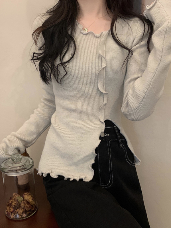 Solid Color Rib V Neck Slim Long Sleeve Knit