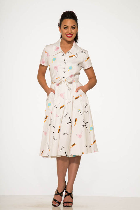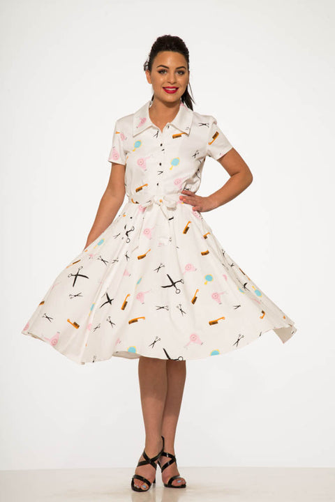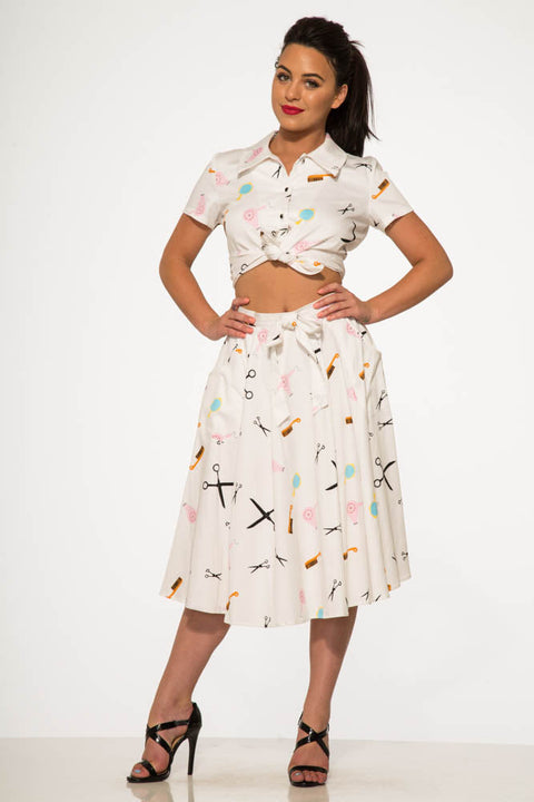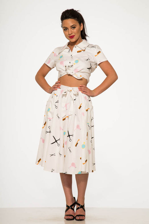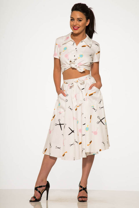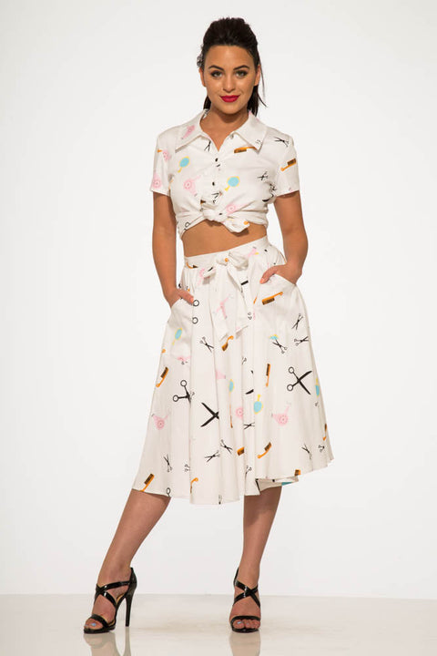 Snip, style, and serve serious retro realness in this beauty shop-inspired set from Orchid Bloom! Featuring a crisp button-up tie-front top and a matching full swing skirt printed with charming scissors, combs, and curlers, this duo is a love letter to vintage salon days.