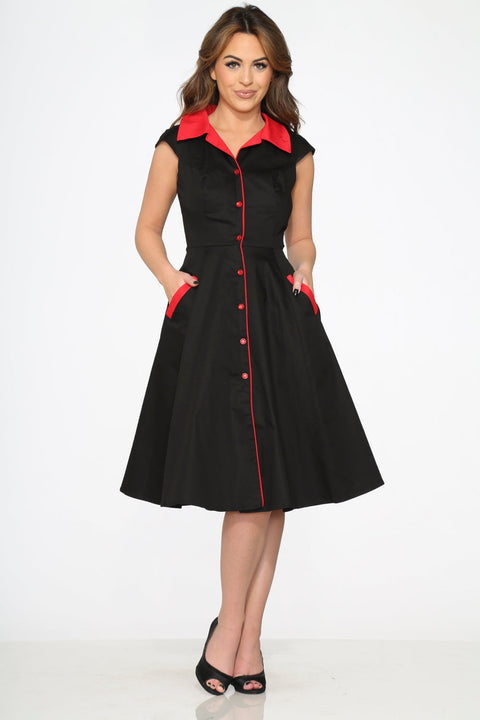Timeless with a bold twist, the Black Red Trim Swing Dress by Orchid Bloom brings vintage flair and modern confidence together. The classic black base is accented with striking red trim, making it a standout choice for both day and evening wear.