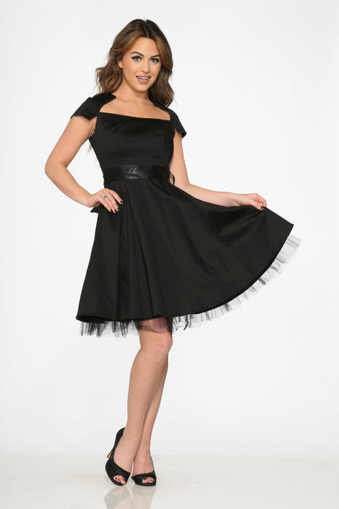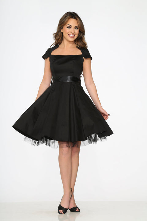 Elegance meets timeless style in the Orchid Bloom Black Swing Dress. With its classic square neckline and cap sleeves, this dress brings a vintage-inspired touch to any occasion. The swing silhouette flatters every curve, while the sleek waistband detail adds a hint of sophistication. Crafted from a cotton-spandex blend that provides gentle stretch and comfort, it also features a side zipper for easy dressing and a peek of tulle at the hem for an extra dose of charm.