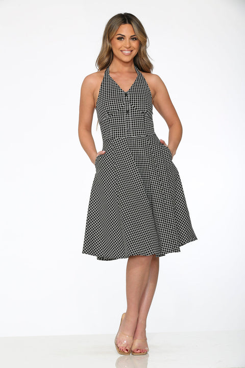 Make your next move a stylish one with the Orchid Bloom Black& White Checkmate Halter Dress! Featuring a bold checkerboard print and a flattering halter neckline, this retro-inspired stunner is made for twirling, winning hearts, and standing out from the crowd. Crafted from a breathable cotton-spandex blend, it’s a playful nod to vintage cool with a modern twist.
