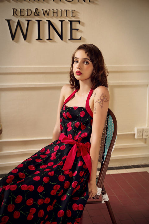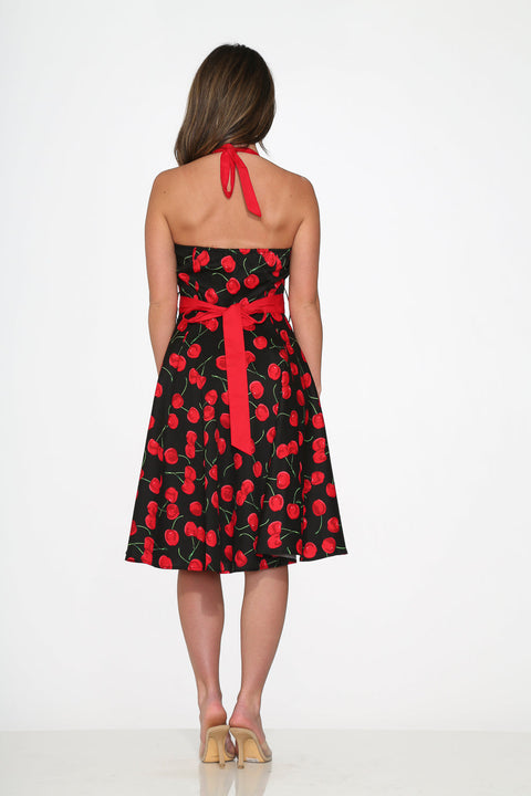 Channel classic pin-up style with the Black& Red Cherry Halter Dress by Orchid Bloom. Featuring a bold red cherry print on a sleek black background, this halter-style swing dress brings vintage flair to warm-weather days and fun nights out.