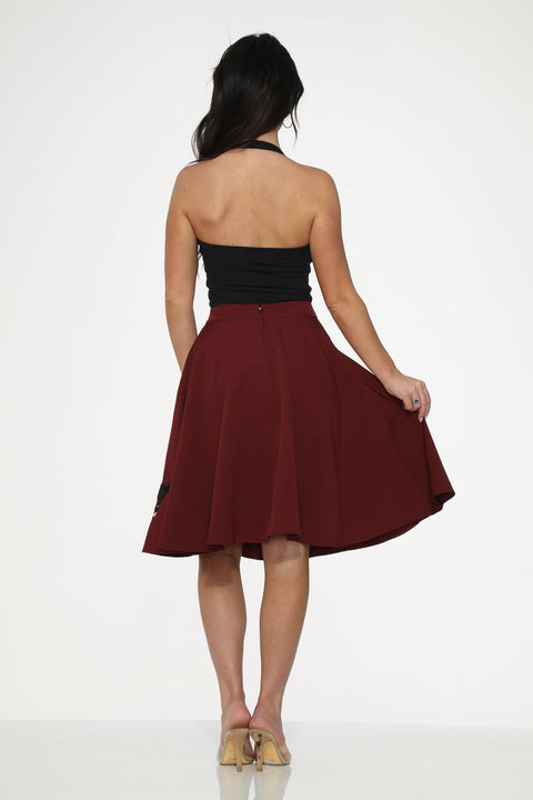 Turn heads and twirl with flair in the Orchid Bloom Burgundy& Black Embroidered Poodle Swing Skirt! With its deep burgundy hue and classic black poodle patch, this skirt is pure vintage charm with a bold twist. The flouncy silhouette and comfy stretch blend make it perfect for moonlit strolls, retro dances, or simply making every sidewalk your runway.
