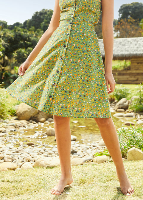 Short sleeve ruffle collar blouse featuring a vintage style print of sweet chickens and garden patch veggies