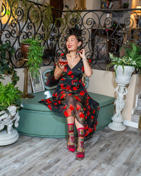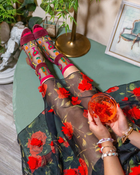 Our Cocktail Hour black sheer sock features wine glasses, martinis, and wine bottles with an unexpected olive twist. The graphic print and electrifying colors give this sock an art museum vibe, perfect for paint and sip nights with the girls. Finished with a mulberry colored cuff, heel, and toe for a sultry look.
