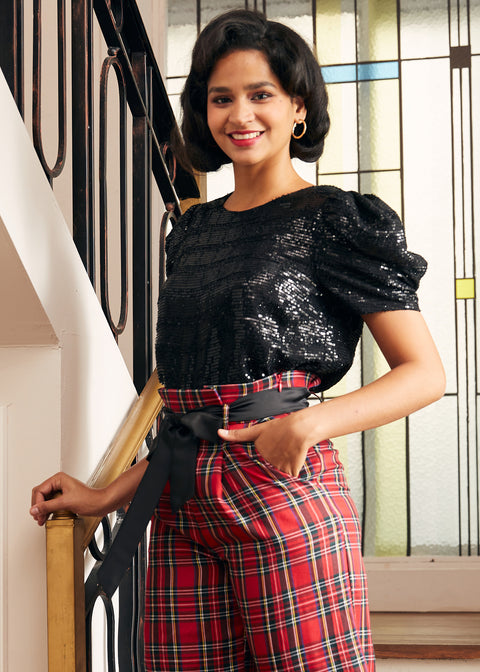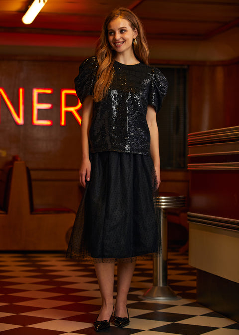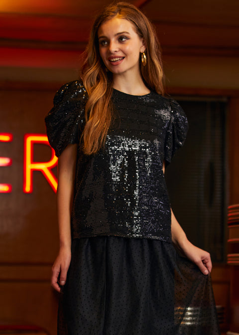 Celebrate the season in style with the Festive Frolic Bubble Sleeve Crew from our ModCloth namesake label. Its deep midnight black hue and bold bubble sleeves are a homage to classic elegance and holiday mystery. This top pairs perfectly with both skirts and trousers, offering a versatile piece that’s equal parts coziness and sophistication. Whether you’re attending a glamorous holiday party or indulging in serene winter evenings, it’s a garment that embodies the magical essence of the season.
