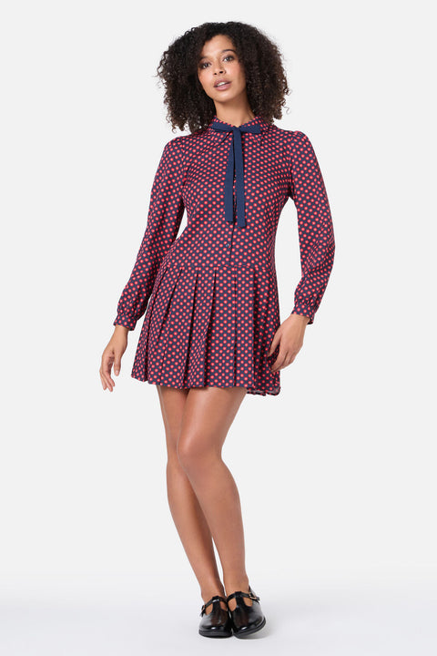 With a drop waist silhouette, pointed collar, button-up front to the waist, and pleated mini skirt, this style is all about vintage flair. The contrast front tie adds a sweet finishing touch.
