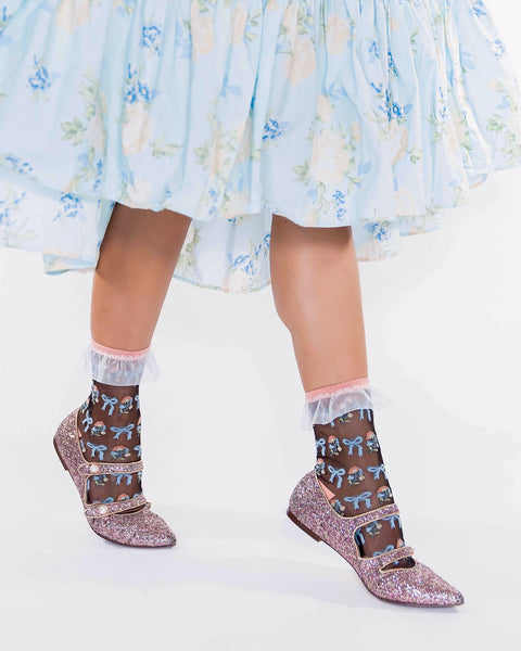 Inspired by the Bridgerton regency era, this ruffle ankle sock features pastel florals and sweet bows set against black sheer fabric. Finished with a white sheer ruffle cuff for maximum girlishness. Companion sock to the Repeat Floral Ruffle Sheer Sock – get one for you and one for your bestie!