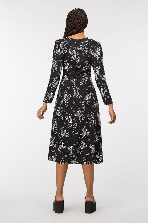 Designed with a fitted bust and a flared skirt that falls to a midi length, this dress exudes timeless femininity with a dark twist. The soft viscose fabric ensures comfort and flow, making it an ideal choice for both casual and special occasions.