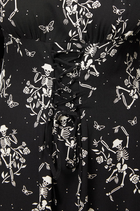 The Garden Skelly Dress by Dangerfield is a captivating blend of gothic style and cottagecore vibes, perfect for those who embrace both dark aesthetics and whimsical charm. This dress features long sleeves with gathering at the shoulders, adding a touch of drama and elegance to the silhouette. The low-cut, square-shaped neckline enhances the gothic allure, while the corset-style tie at the front waist cinches the dress beautifully, creating a flattering fit.
