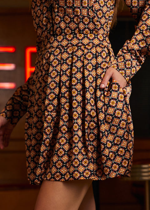 Introducing the Geo Pleated Mini Skirt from our ModCloth collection, a whimsical wardrobe wonder. This skirt is a dazzling marvel, featuring a captivating geometric pattern in radiant gold that promises to turn ordinary days into occasions. Its meticulously crafted box pleats offer both form and whimsy, ensuring a polished silhouette that pairs seamlessly with cozy turtlenecks or celebratory tops. Perfect for both glamorous gatherings and elegant dining, this skirt ensures you’ll shimmer in the spotlight of admiration.
