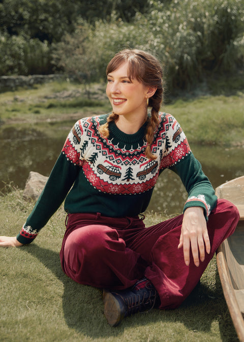 Channel nostalgic road-trip vibes in the Golden Days Raglan Sweaterby our ModCloth namesake label. This festive knit features a forest-green base decorated with charming Fair Isle details—complete with snow-topped trees, vintage woodie wagons, and cozy cabin motifs in cream and red. A modern take on a classic holiday sweater, it’s soft, cheerful, and ready for every fireside chat or frosty stroll. Pair it with corduroy, denim, or your favorite mug of cocoa for instant main-character energy.