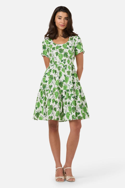 A romantic summer mini dress inspired by Tuscan vineyard vibes. Featuring juicy grapes, twirling vines, and luscious leaves, this green tiered dress combines playful charm with effortless elegance—perfect for sunny days and garden strolls.