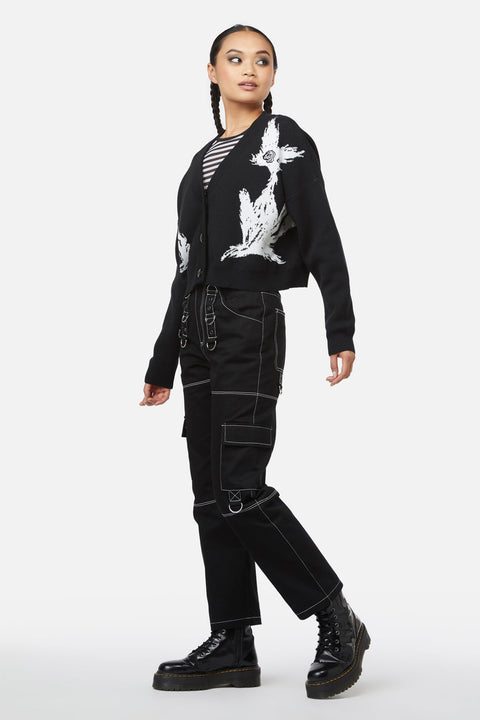 Snuggle up in the enchantingly cozy realm of the ‘Kitty’ Intarsia Cardigan by Black Friday– a snug masterpiece that playfully marries warmth with whimsical charm. Crafted from a snugly blend of nylon and acrylic, this cardigan envelops you in a hug of softness that’s hard to leave. The boxy cut and relaxed fit invite a laid-back vibe, perfect for weekend lounging, creative brainstorming sessions, or casual coffee dates with friends. Its button front adds a classic touch, allowing for easy layering over your favorite tees or dresses. The adorable ‘kitty’ intarsia artwork woven into the fabric in a monochrome palette adds a dash of cheekiness, making it a delightful choice for any cat lover’s wardrobe. Whether it’s a chilly evening stroll or a cozy night in, this black Intarsia cardigan promises warmth, comfort, and a sprinkle of fun.
