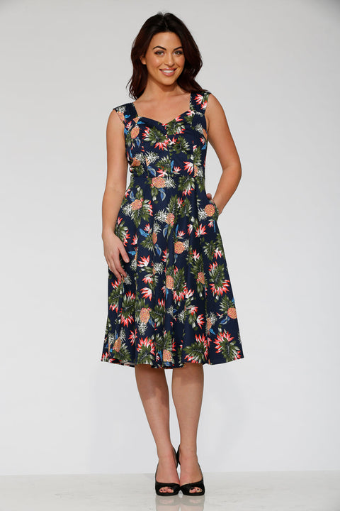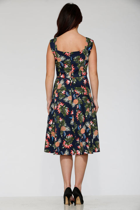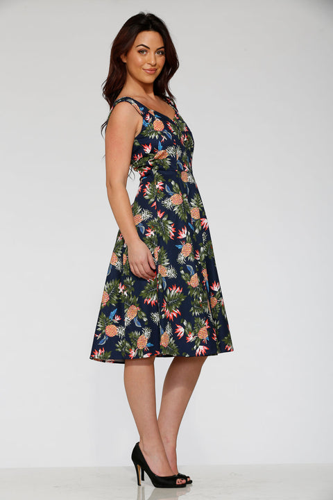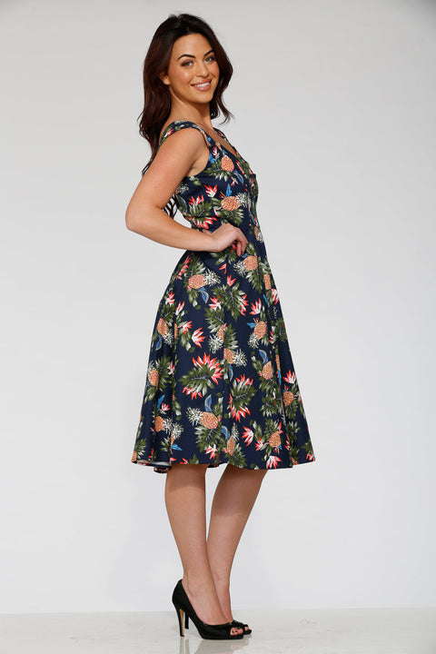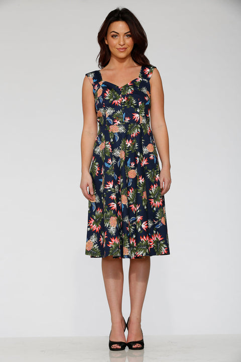 Bring the island breeze to your wardrobe with the Orchid Bloom Navy Hawaiian Swing Dress! Bursting with tropical blooms and pineapple charm, this vibrant vintage-inspired beauty captures the spirit of aloha in a flattering fit-and-flare silhouette. The ruched bodice, wide straps, and twirl-ready skirt make it perfect for sunny escapes or staycation daydreams.