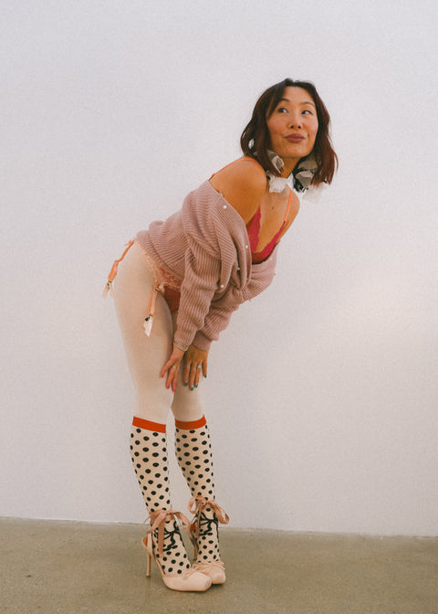 Our Fall favorite Polka Dot Bow sheer sock is now available in knee high length! Designed to turn heads and elevate any outfit, classic black polka dots are paired with a bow on the ankle for added femininity. Finished with a reinforced cotton red cuff, toe, and heel for a striking pop of color. Pair with a knee length dress for a chic work look, or go high fashion and layer over colored tights.