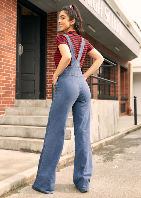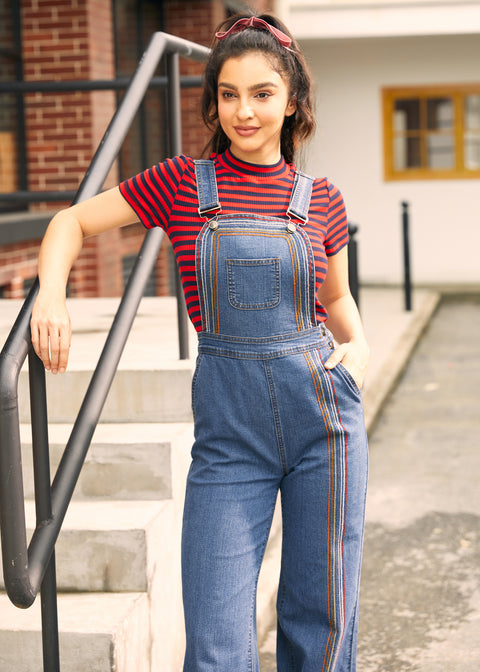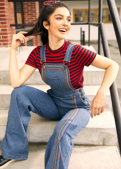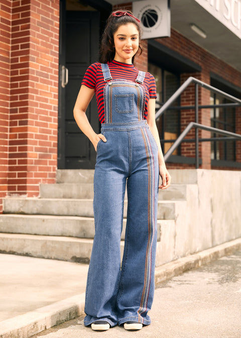 Take a spin around the roller rink in these rainbow-adorned, vintage-inspired overalls from our ModCloth label! Crafted from slightly stretchy denim, these blue wide-legged bottoms feature nifty side pockets, adjustable, buckled shoulder straps, and embroidery spanning from the bib down to the hem, so you can rule the rink in color!