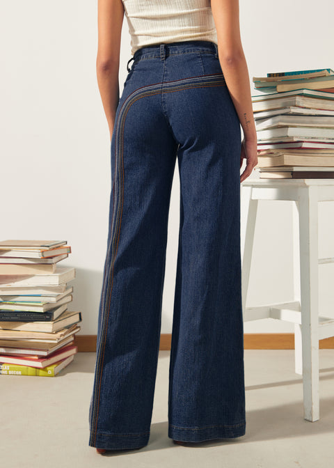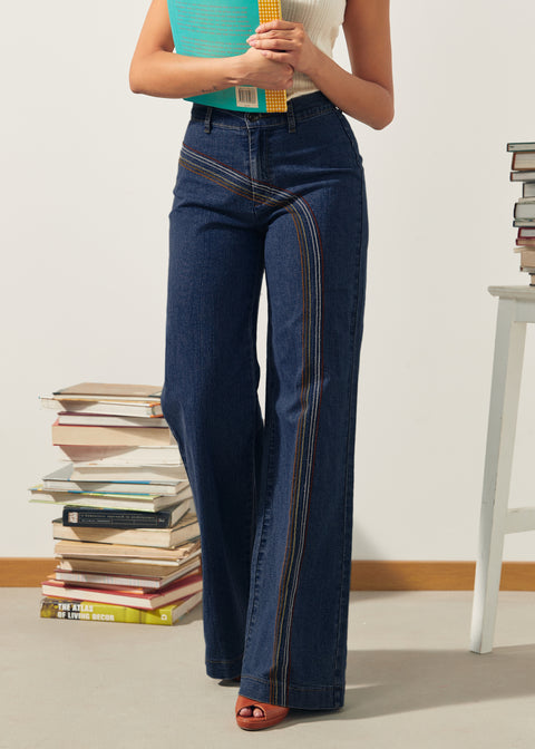 Dive into the 1970s with these ModCloth jeans! Rainbow-adorned, they feature a classic high-waisted, wide-leg silhouette. The dark blue hue is crafted from a low-stretch denim blend of 70% cotton, 28% polyester, and 2% spandex. Our denim (9.5 oz after wash) is intentionally lightweight to create the signature bell-bottom drape and flow.Polyester adds strength and shape retention, standard for premium denim. A zip fly and button closure add a modern touch. Roy G Biv embroidery runs from front to back, adding a unique flair.