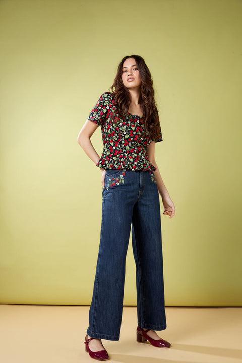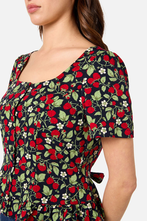 Add a pop of playful charm to your wardrobe with the Raspberry Short Sleeve Top by Princess Highway. Featuring a vibrant print of juicy raspberries and delicate blossoms on a rich navy base, this sweet cotton-viscose blend top is full of vintage-inspired flair. With its soft square neckline, puff sleeves, and ruffle hem, it’s a go-to for sunny days and casual outings alike.