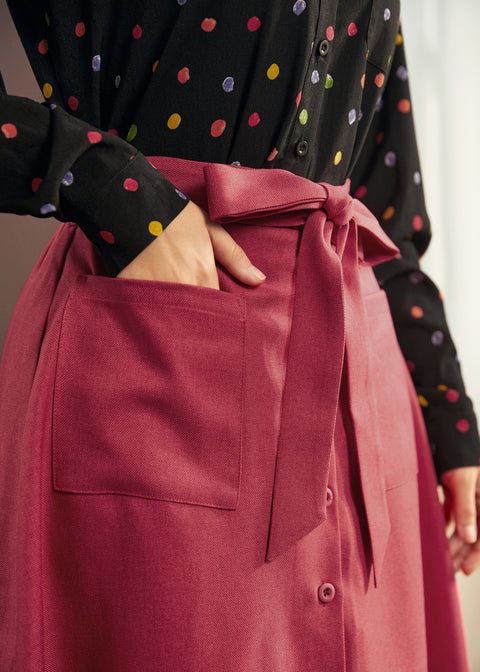 Add a dash of vintage charm to your everyday looks with the Romantic Rendezvous Skirtfrom our ModCloth namesake label. This button-front A-line silhouette features oversized patch pockets, a removable waist tie, and a soft drape that flatters every figure. Its rich berry hue makes it the perfect pairing for cozy sweaters, printed blouses, or your favorite holiday heels—romance in motion, no occasion required.