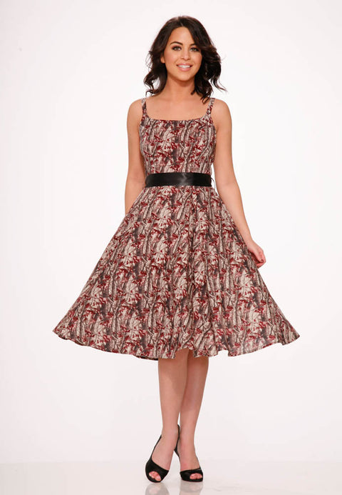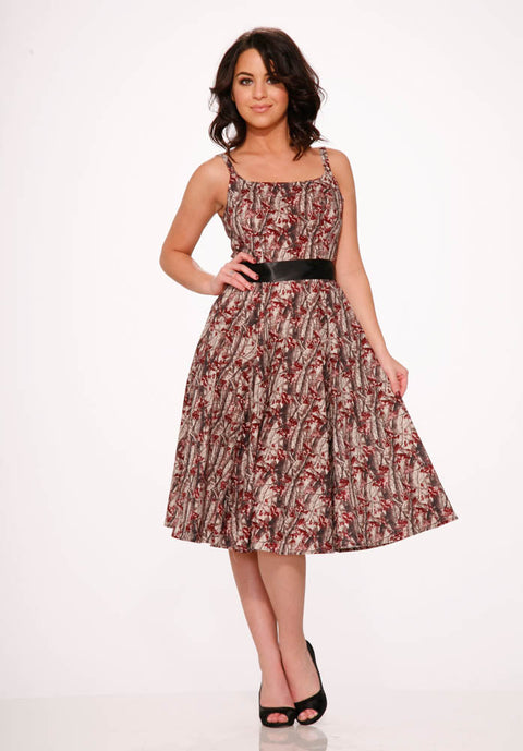 Step into a woodland reverie with the Orchid Bloom Sylvania Swing Dress. This vintage-inspired number features a charming forest print in rich, earthy tones—perfect for adding a bit of storybook whimsy to your wardrobe. Adjustable braided straps and a satiny waistband finish the look with flair.