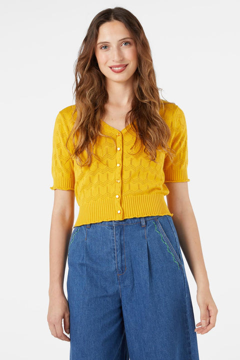 Short sleeve, knitted cardigan with a v-neckline. Made of a lightweight cotton, perfect for summer