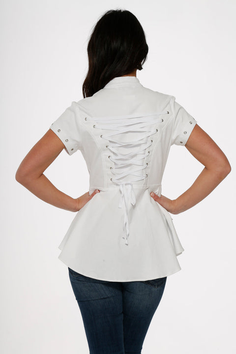 A crisp and modern high-low top in white, featuring a flattering silhouette and practical side pockets. With comfortable stretch and a center front zipper, this versatile piece pairs effortlessly with pants, skirts, or jeans for casual or dressed-up looks.