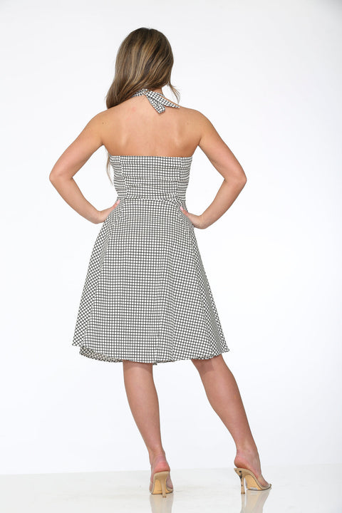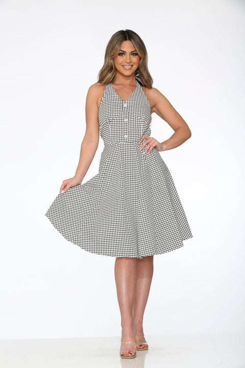 Play your winning style move with the Orchid Bloom White& Black Checkmate Halter Swing Dress! With its bold checkerboard print and classic halter neckline, this retro beauty brings vintage flair and playful confidence to every twirl. Crafted from a breathable cotton-spandex blend, it’s perfect for sunny days, dance nights, and making a statement wherever you go.