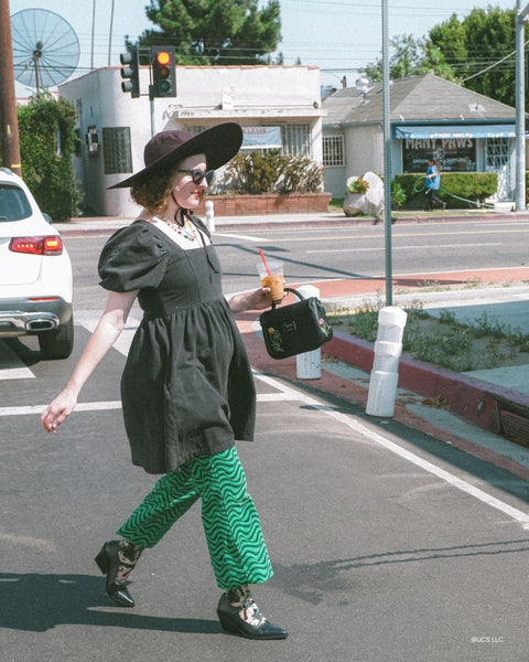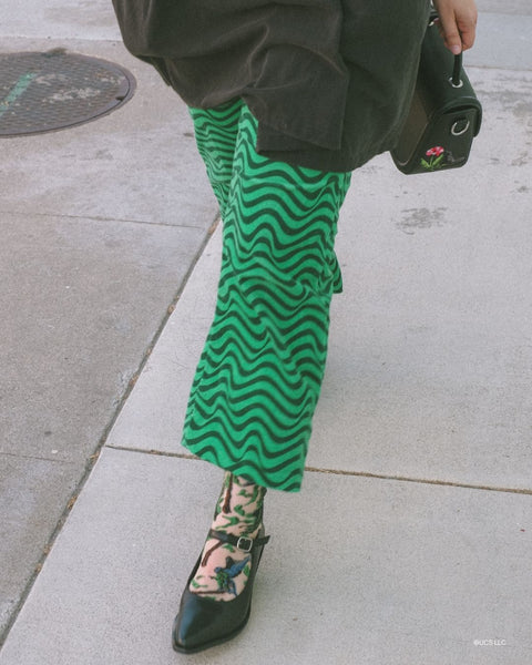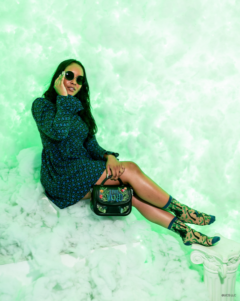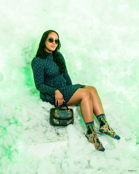Defy gravity with the Elphaba Silhouette Sheer Crew Sock. This spellbinding design features dramatic silhouettes of Elphaba in her iconic hat and flowing cape, surrounded by swirling details of brooms, monkeys and leaves that echo her magical presence. Set against a sheer nude base with deep emerald and black, these socks capture Elphaba’s fearless spirit and signature style. A dark blue cuff, toe, and heel complete the design, making these the perfect accessory for fans who want to add a bold, witchy edge to their outfits.