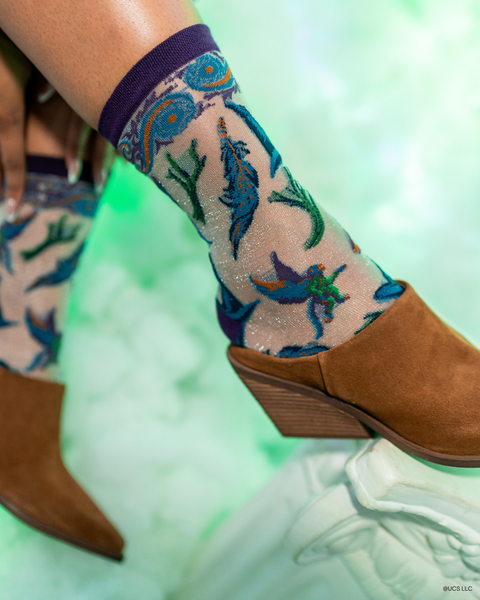 Channel Elphaba’s fierce magic in our Elphaba’s Power Shimmer Sheer Crew Sock. This bold design features Elphaba’s signature motifs of her hat, broomstick, and swirling feathers, symbolizing her strength and defiance. A touch of sparkle runs through the sheer base, giving these socks an otherworldly shimmer. Rich indigo and violet tones pay tribute to Elphaba’s iconic look, while a bold purple cuff, toe, and heel complete the design. Perfect for pairing with boots, heels, or even statement sneakers, these socks let you show your Wicked side in style.