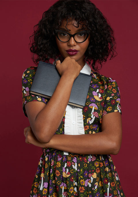 In an homage to our original logo, we fondly present you with a gorgeous new, hand-drawn print featuring a plush moss green forest floor full of adorable button mushrooms capped in shades of red, yellow, and purple that are surrounded by cheerful flowers and little baby beetles. Made from a lightweight woven fabric, this darling fit-and-flare dress is outstanding with its contrasting white point collar and ruffle-trimmed placket of buttons at the bodice. Boasting short sleeves, and a matching and removable belt at the gathered waistline that leads to an above-the-knee flare skirt with handy side pockets, this 70’s inspired mini dress is an easy “yes.”