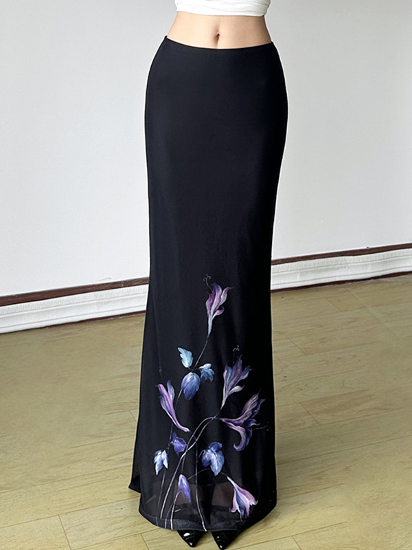 Floral Print Open Mesh Maxi Skirt