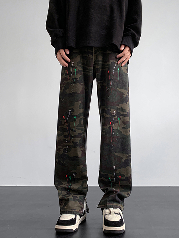 Men’s Camo Splash Ink Print Side Zip Up Loose Jeans