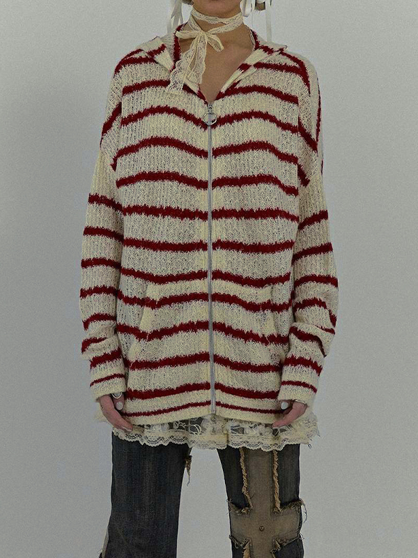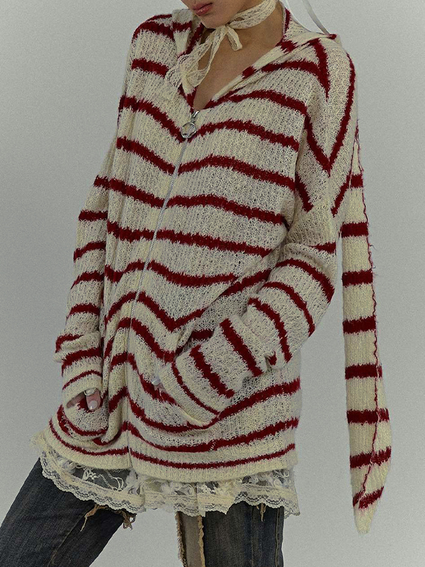 Rabbit Ear Styling Hooded Stripe Cardigan