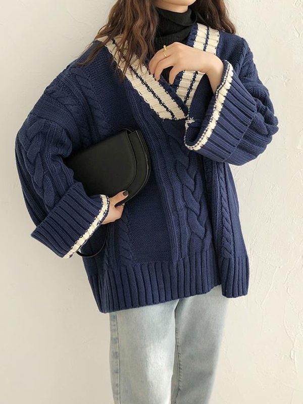 Contrast Color V Neck Cable Knit Sweater